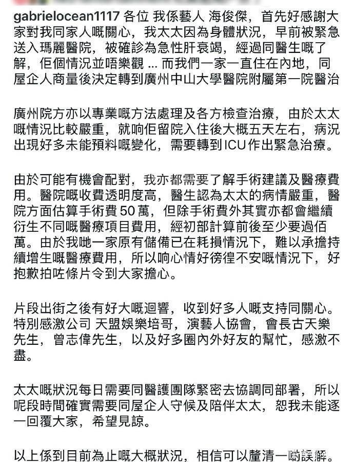 故事的起点,是一场猝不及防的重病。今年10月,任职化妆师的莫家慈起初只是呕吐不适,以为是普通胃炎,直到皮肤发黄才查出急性肝衰竭,唯一的生路就是换肝。这个消息像惊雷炸碎了这个结婚8年的小家庭:海俊杰近年在TVB多演配角,一集片酬不过万,疫情期间大半年没戏拍,夫妻俩定居中山的80平小屋月租仅3000,所有积蓄加起来不到30万,而换肝手术及后续治疗需要150万港币。
