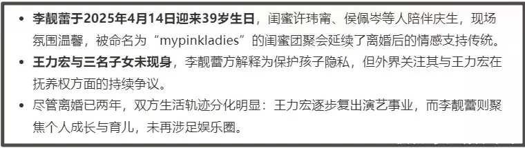 娱乐圈离婚夫妻共同抚养孩子的情况还是挺多的,李小璐和贾乃亮都能给孩子一起过生日,王力宏和李靓蕾看不出一点和解的意思。